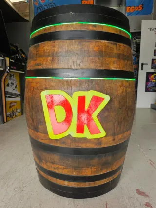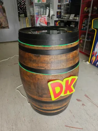 Barril de estilo retro, perfecto para un ambiente de cocktail o arcade. - Diseño inspirado en Donkey Kong. - Incorpora iluminación LED verde. - Tapa superior de cristal.