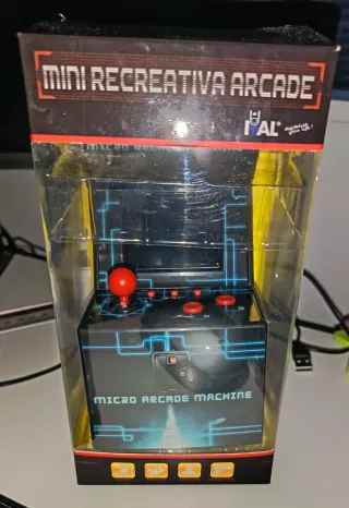 Mini máquina recreativa tipo arcade de la marca IAL. Presenta un diseño compacto y portátil. - Contiene joystick y botones de juego. - Decoración con líneas de circuito en azul. Con 240 juegos. Funciona perfectamente.