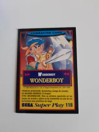 Carta de personaje de Wonderboy, publicada en la revista SEGA Super Play número 118. - Publicada en 1991/1992. - Primera aparición: Wonderboy (Juego de arcade). - Enemigo principal: El dragón. - Información adicional: Hizo su debut en los juegos de arcade y se ha convertido en uno de los personajes más prolíficos de Sega.