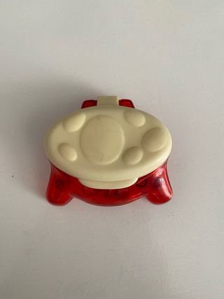 Consola portátil SEGA con diseño divertido y personajes de dibujos animados. - Carcasa de plástico rojo translúcido. - Tapa superior con ilustraciones de SEGA y personajes. - Pantalla LCD. - Dos botones amarillos. - Diseño compacto y plegable.