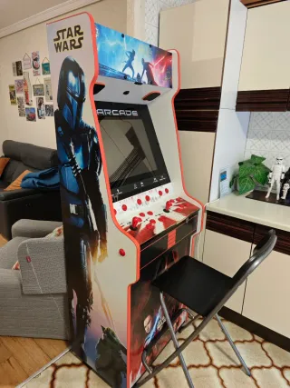 Máquina arcade temática de Star Wars con diseño llamativo. - Panel de control con joysticks y botones. - Pantalla de juego. - Gráficos de Star Wars en los laterales y marquesina. Con karaoke, pinball y muchos demos de consolas. Una gozada