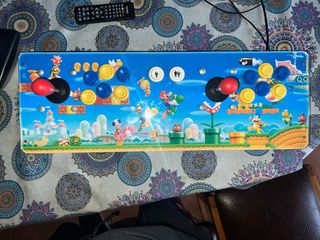 Este arcade stick presenta un diseño vibrante inspirado en Super Smash Bros., con una gran variedad de personajes icónicos. - Palanca y botones. - Diseño multicolor con personajes de Nintendo y otros juegos. - Carcasa de madera resistente. - El boton de insert coin se ilumina. - Medidas: 43 cm ancho x 28 largo - Los botones y palanca estan soldados a la placa de un mando usb.