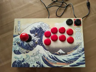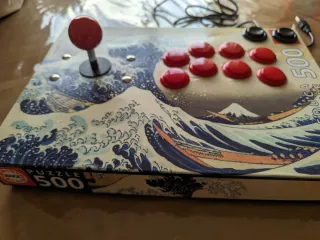 Joystick arcade con un diseño único inspirado en La Gran Ola de Kanagawa. Fabricado a partir de una caja de puzzle. Reforzado en el interior con placas panel. Varias capas protectoras de barniz. Componentes de la más alta calidad. Joystick y botones sanwa japoneses. Controladora zero delay. Fabricado y ensamblado a mano. Componentes Nuevos