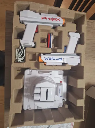 Proyector de juegos arcade Projex de Bizak. Permite proyectar blancos móviles sobre cualquier pared. - Blancos móviles que se proyectan sobre cualquier pared de color claro. - No son necesarios ni sensores ni pantallas. - 5 posibilidades de juego. - Incluye blancos animados. - Desde Nivel Principiante hasta Nivel Experto Muy poco uso porque se lo compramos ya siendo más mayor. Ideal de 6-9 años