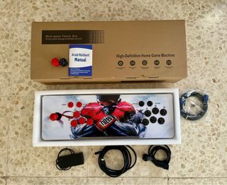 Consola de juegos arcade estilo Pandora Box, ideal para disfrutar de clásicos. - Incluye manual de instrucciones. - Dos joysticks y múltiples botones de acción. - Incluye dos botones de repuestos. - Como nueva, con el plástico de proteccion en los botones y en la consola. - Tiene muchísimos juegos. - Contiene todos los cables.. - La consola se ilumina y contiene botón de volumen. - Se ha usado dos veces y conserva caja y todo original.