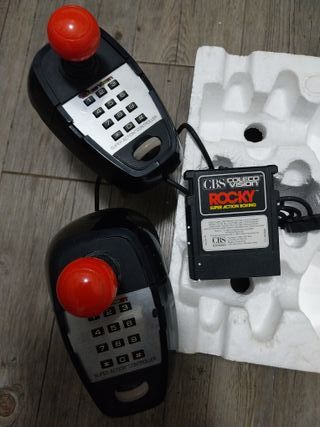 Set de dos controladores Super Action para Colecovision. - Con los corchos, manuales y juego Rocky. - Diseño ergonómico en color negro. - Palanca de mando roja. - Cable de conexión.
