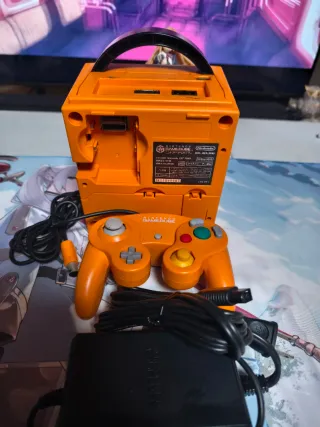 Consola de videojuegos clásica en color naranja. Le falta una de las tapas traseras pero funciona perfectamente Incluye mando y cables - Modelo: GameCube - Marca: Nintendo Japonesa