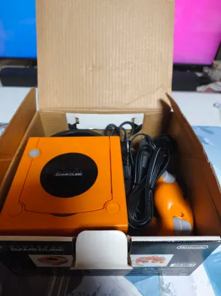 Consola Nintendo GameCube en su caja original. Una de las tapas traseras está suelta - Incluye todos los componentes originales. - Diseño distintivo en color naranja.
