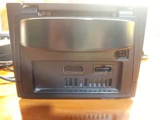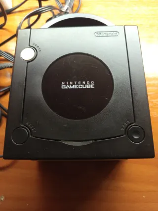 Consola Nintendo GameCube en color negro. - Diseño compacto y distintivo. - Puertos para mandos y tarjetas de memoria. Con sus dos mandos originales y juego incluido