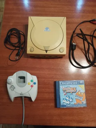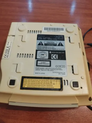 Consola Sega Dreamcast , llevaba 15 años guardada en un armario, en donde cogió este feo color que tiene. La consola funciona como se puede ver en las fotos, pero, cuando le meto el juego, me dice que no he introducido el disco. No se si es fallo del juego o del lector. Ya que cuando se guardó en el armario funcionaba perfectamente. El modelo exacto de la consola viene en la foto 2 - Mando de control original. - Juego ChuChu Rocket! incluido. ( Caja en mal estado) - Cables de conexión. ( Tienen algo de cinta, como se puede ver en la foto 3)