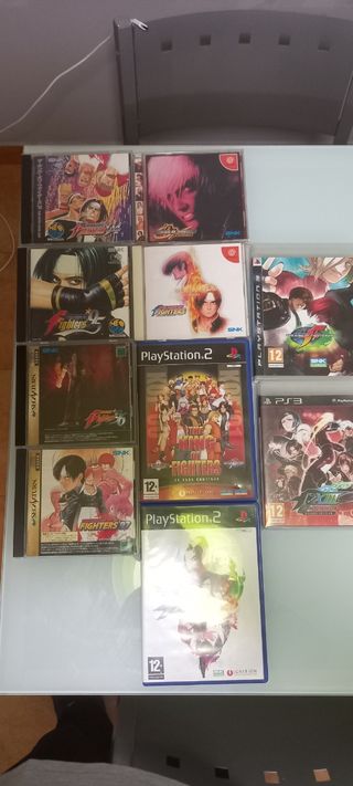 La colección se compone de: -kof 94 neo geo cd (japon)20€ -kof 95 neo geo cd (japon)20€ -kof 96 sega saturn (japon)20€ -kof 97 sega saturn (japon)20€ -kof 99 dream mach sega dreamcast (japon)30€ -kof 99 evolution sega dreamcast (japon)30€ -kof 2000 / 2001 la saga continúa play station 2 (pal españa)20€ -kof 11 play station 2 (pal españa)25€ -kof 12 play station 3 (pal españa)30€ -kof 13 delux edition play station 3 (pal españa)25€ Todos funcionando para sus respectivas consolas , en perfecto estado y con manuales, para las versiones japonesas necesitarás videoconsola japonesa o en su defecto algún sistema de multiregion muy fáciles