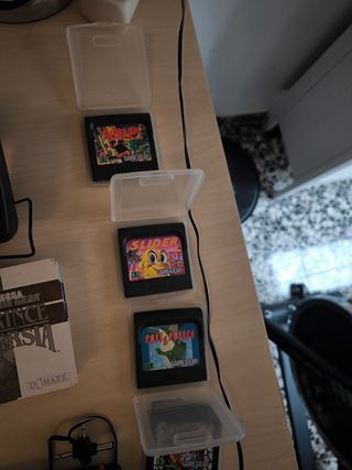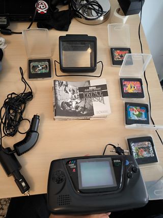 Con los juegos originales e instrucciones que se ven en las fotos, incluido el "Prince of Persia". Lupa original aumentadora de pantalla, instrucciones originales de muchos más juegos que no encuentro, dos cargadores de mechero para usar la consola en el coche, uno de la luz normal, la consola va bien, pero desde hace dos días la pantalla se ve menos. Está bastante bien, pero hacía como doce años que no la encontraba. No tiene mucho uso y se nota en botones y mando.