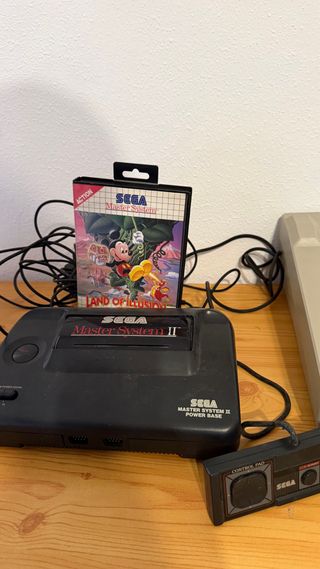Consola Sega Master System II en color negro. Incluye el juego Land of Illusion y un mando. - Consola Sega Master System II. - Juego Land of Illusion para Master System. - Juego Sonic para Master System - Mando Control Pad de Sega.( El mando necesita una puesta apunto en los cables) Sin Caja.