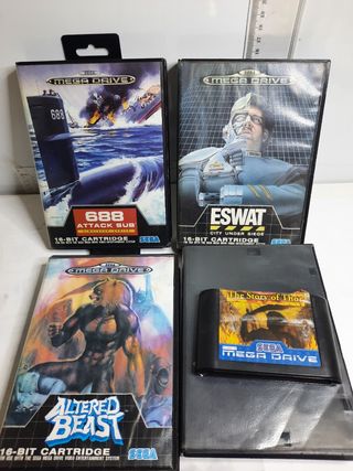 venta de 4 juegos de sega mega drive 688 attack sub completo español 25€ eswat made in Japan completo 55€ altered beast made in China completo 40€ the story of thor made in Reino Unido sin manual ni caratula 100€ todos versión PAL precio todos 200€