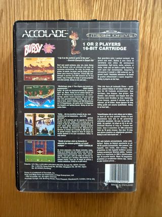 Vendo el clásico de plataformas Bubsy para Sega Mega Drive en buen estado. Incluye: Caja original (con un pequeño roce en la parte trasera, ver fotos). Manual de instrucciones en perfecto estado. EXTRA: Incluye el folleto publicitario original de juegos Accolade de la época. Cartucho impecable, probado y funcionando. Ideal para completar tu colección de Mega Drive. Entrega en mano o envío por Wallapop.
