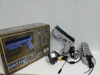 Pistola de luz The Real Arcade de Joytech, compatible con PlayStation y consolas Sega Saturn. - Incluye la pistola, la caja original, el pedal y el adaptador de corriente. - Incluye características como la función de retroceso (recoil) y un pedal para acciones como recargar munición. - Sólo para televisores de tubo (CRT), no compatible con televisores modernos planos. - En su caja original