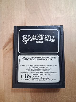 Cartucho de videojuego Carnival para Atari Video Computer System. Licencia de Sega Enterprises Inc. y Atari Inc. Empaquetado en Inglaterra por Ideal Toy Co. Ltd. Versión PAL del juego original de Sega. El objetivo es disparar a objetivos en movimiento antes de quedarse sin balas.