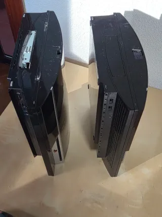 Consola PlayStation 3 en color negro, ideal para piezas o para quien sepa repararla. Una enciende suena como un avión y se apaga la otra con luz roja. No llevan discos duros. No se aceptan devoluciones ya que son para piezas o para reparar. Los dos por 40 - Modelo: PlayStation 3 - Color: Negro