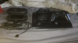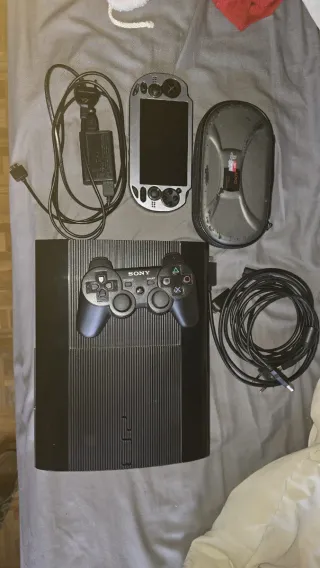 PS3 Super Slim en perfectas condiciones, incluye todos los cables necesarios y un mando Sony original. También contiene juegos MGS V, GTA 4 y Killzone 2. PS Vita Fat en perfectas condiciones, incluye cargador, estuche, carcasa ergonómica y microSD con adaptador de 128GB. Se vende todo junto o por separado. Más información escríbame y mando fotos. Precio negociable