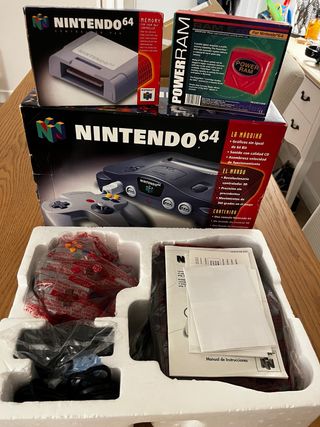 Consola Nintendo 64 en su caja original, lista para revivir grandes momentos. - Incluye consola, mando y expansion de memoria y memory card. - Caja original con embalaje interiores en muy buen estado - Plasticos y manuales originales Pago por bizum o wallapay
