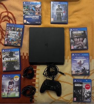Consola PlayStation 4 slim 500gb en color negro, junto con una selección de 8 videojuegos. la consola y el mando estan usados pero funcionan a la perfeccion sin ningun tipo de problema. - si desea algun producto por separado consultemelo al privado - Incluye mando DualShock 4 marca nacon con botones traseros - Incluye: Uncharted: The Nathan Drake Collection, Uncharted 4, Grand Theft Auto V, Call of Duty: Infinite Warfare, Call of Duty: WWII, Horizon Zero Dawn , tom clancy’s raimbow six siege X y FIFA 16 - Incluye cables de conexión.