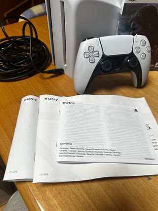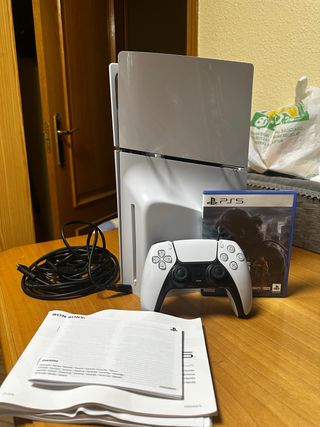 Se vende consola PlayStation 5 SLIM 1TB con lector de discos, mando DualSense, soporte horizontal, cables originales (HDMI, corriente y carga mando) y libro de garantía, caja incluida. Opcional sin juego The Last Of Us II 400€ La vendo por falta de uso, esta como nueva, solo unos meses de uso y guardada en caja