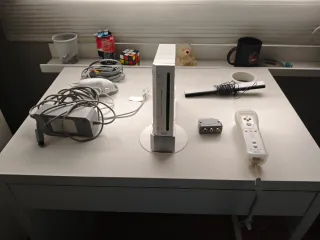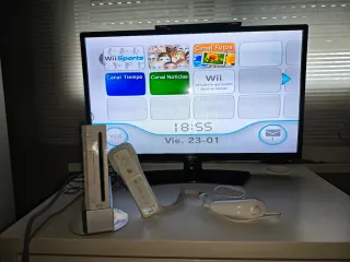 Consola Nintendo Wii en color blanco. Incluye accesorios originales: - Mando - Nunchuk - Cargador - Base/soporte - Sensor - Cable de video Se añade como regalo el disco original de videojuego WII Sports (caja no incluida)