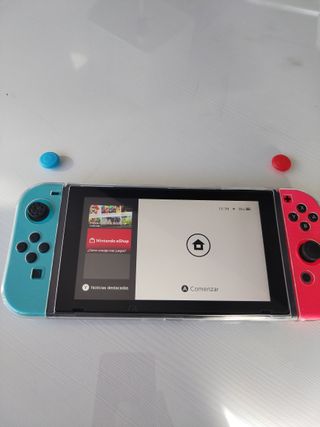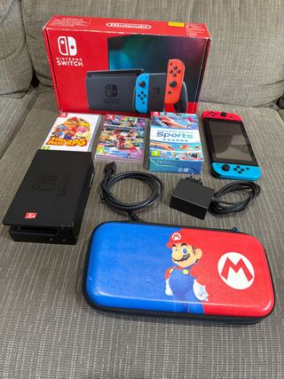 Pack Consola Nintendo Switch con juegos y accesorios. En buen estado (ver fotos). Funciona perfectamente. - Incluye Super Mario RPG, Mario Kart 8 Deluxe y Nintendo Switch Sports. - Incluye funda protectora de Mario oficial Nintendo (con 3 protectores de los stick dentro de regalo) - Incluye base de carga y cables (todos sus accesorios) - Tarjeta MicroSD oficial Nintendo 128 GB (con dibujo champiñon de Mario) - soporte de carga mandos Joy-Con tambien incluido.