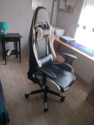 Silla gamer en muy buen estado, con un diseño moderno en blanco y negro. - Estructura ergonómica. - Cojines para cabeza y lumbares. - Base con ruedas para fácil movilidad.