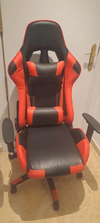 Silla ergonómica de estilo gamer, diseñada para largas sesiones. - Diseño en color rojo y negro. - Respaldo alto con soporte lumbar y cervical. - Reposabrazos acolchados. - Base estable con ruedas.