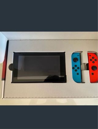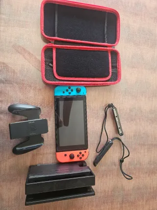 Consola Nintendo Switch en colores azul y rojo. La consola es el modelo estándar, aunque la versión posterior a 2019. También incluyo obviamente el dock y como extra los siguientes accesorios: - Funda de transporte - Funda protectora de Pokémon (no cabe en el dock, solo es para jugar en portátil) - Protector de pantalla (lo incluyo, pero no está puesto, está aparte sin utilizar) - Dos fundas para los sticks (unas de color blanco y Negro y otras rojo y azul - Tarjeta microSD Lexar de 128 GB