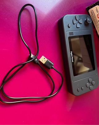 Consola portátil estilo retro con diseño llamativo. - Pantalla a color. - Botones de control direccional y de acción. - Incluye cable de conexión.