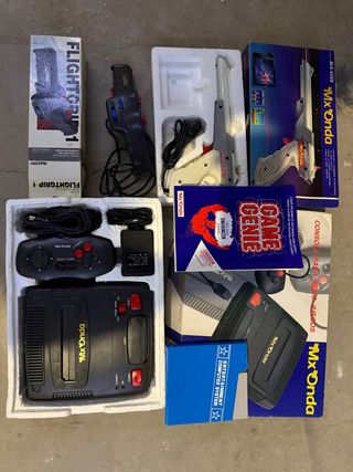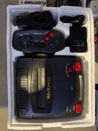 Pack Retro Mx Onda (Tipo NES) + Game Genie + Accesorios ¡Joyón para coleccionistas de los 80/90! Vendo consola Mx Onda (clon de la mítica Nintendo NES) muy completa y con extras difíciles de encontrar en este estado. El pack incluye: • Consola Mx Onda original con su caja y corchos. • 2 Mandos con función Turbo. • Game Genie (el periférico de trucos) con su libro de códigos. • Pistola Photo Gun 3 con caja original. • Joystick Flightgrip 1 con caja (estilo aviador). • Cartucho de juego, cableado y adaptador de corriente.