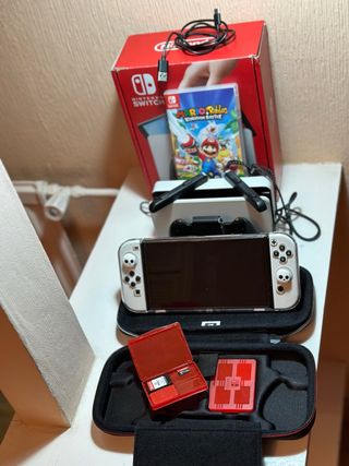 Consola Nintendo Switch modelo OLED en color blanco, ideal para disfrutar de tus juegos favoritos. - Incluye funda de transporte original de nintendo - Incluye juego Mario Rabbids - Incluye juego FIFA 22. - Incluye tarjeta de memoria microSDXC de 256GB. - Incluye carcasa trasparente de protección de consola y mandos también tiene protector de pantalla y gomas de análogos - Incluye base de carga y cables. -caja original Esta nueva prácticamente lo compre por afición pero no me gusto si alguien tiene un play 5 al cambio y encimo o otra consola como xbox también háblame y miramos