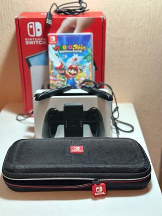 Consola Nintendo Switch con sus accesorios. - Incluye base de carga. - Mandos Joy-Con en colores azul y rojo. - 4 Juegos incluidos: Mario Kart 8, Zelda Tears of the Kingdom, Super Mario Bros Wonder y Pokémon Let's Go Pikachu. - Cable HDMI Comprada en enero de 2022, se vende por falta de uso. Incluye caja original y ticket de compra.