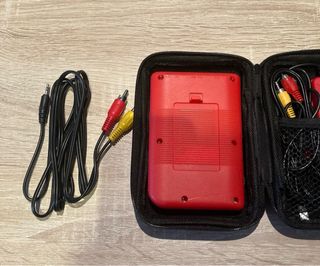 Consola portátil vintage en color rojo, ideal para llevar a todas partes. Incluye varios accesorios para una experiencia completa. - 400 juegos arcade (Super Mario, Tetris...). - Batería de litio. - Consola portátil - Mando adicional - Cable de conexión AV - Cable de carga USB - Estuche de transporte