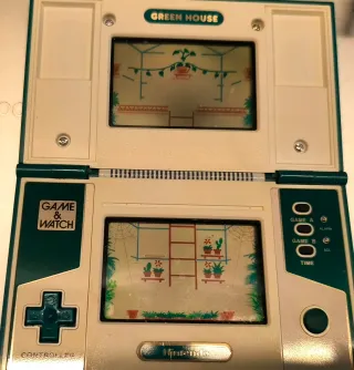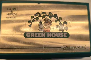 Consola portátil clásica de Nintendo, modelo Green House. - Diseño Multi Screen. - Carcasa dorada con detalles verdes.