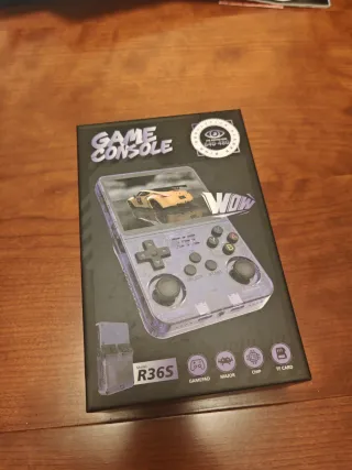Consola portátil para juegos. - Diseño transparente en color morado. - Pantalla con imagen de coche deportivo. - Incluye iconos de mando, chip y tarjeta TF.