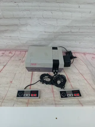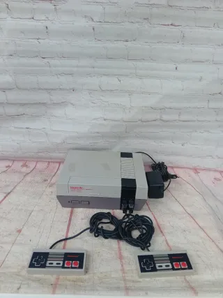 Consola clásica Nintendo NES en colores beige y gris. Un icono del entretenimiento. - 2 mandos y cableado correspondiente. - Diseño retro. - Ideal para coleccionistas. Tiene un pedacito roto en una esquina de la carcasa.