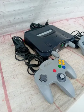 Consola clásica Nintendo 64 con dos mandos grises. - Incluye consola. - Dos mandos grises. - Cables de conexión.