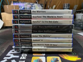 Lote de 9 videojuegos para PlayStation 2, incluye la consola. - The Warriors - Scarface: The World Is Yours - Tenchu: La Ira Del Cielo - Star Wars: Battlefront II - Star Wars Battlefront - Enter The Matrix - Tekken 4 - The Matrix: Path Of Neo - The Getaway