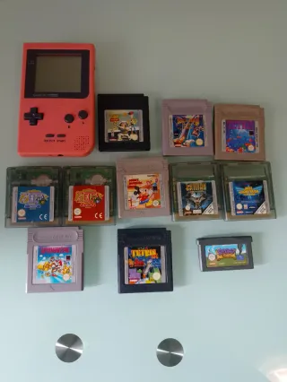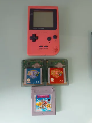 Lote de consola Game Boy en color rosa junto con 11 cartuchos de juegos. - Consola Game Boy. - Juego: Toy Story 2. - Juego: Aladdin. - Juego: Tetris. - Juego: The Legend of Zelda: Ages. - Juego: The Legend of Zelda: Seasons. - Juego: Super Mario Land. - Juego: Batman. - Juego: Buzz Lightyear of Star Command. - Juego: Kirby's Dream Land 3. - Juego: Mickey's Speedway USA. - Juego: Mario Tennis.