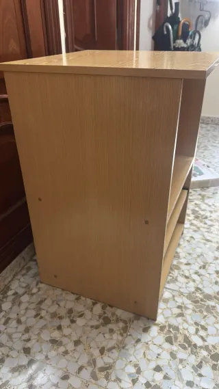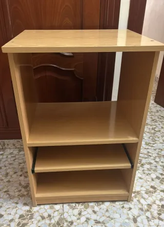 Mueble de madera color claro, ideal para colocar consolas o como estantería auxiliar. Su diseño sencillo se adapta a diferentes espacios. - Estructura de madera. - Tres niveles de almacenamiento. - Un nivel con guías metálicas.