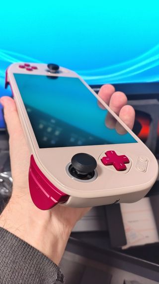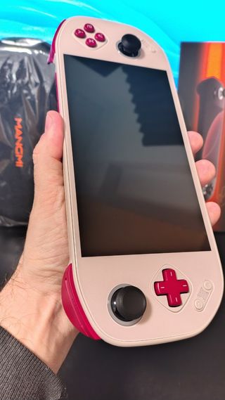 Consola portátil MANGMI Pocket Max en color retro beige. ESTA NUEVA, solo utilizada para grabar un video de YouTube. Se regalan con ella el protector de pantalla y una carcasa protectora portátil rígida. Con pantalla AMOLED a 144 Hz, 7 pulgadas, con resolución Full HD (1.920 × 1.080 píxeles), formato 16:9, brillo máximo de 800 nits y una tasa de refresco de 144 Hz. Diseño modular , se le cambian partes de la consola por otras.