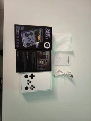 Consola portátil R36S en color blanco y negro. Incluye funda protectora y cable de carga. - Pantalla de alta definición. - Botones de control ergonómicos. - Diseño compacto y ligero. - Funda de transporte acolchada. - Cable USB para carga. Se vende consola R36S, está nueva sin estrenar, lo único es que se tiene que actualizar, y por lo tanto se queda en pantalla en negra, pero eso se arregla fácil con dicha actualización, la vendo porque he comprado el siguiente modelo. La vendo con protector de pantalla puesto, con dos fundas de yostis y funda protectora rígida morada donde también se puede guardar el cable de carga.