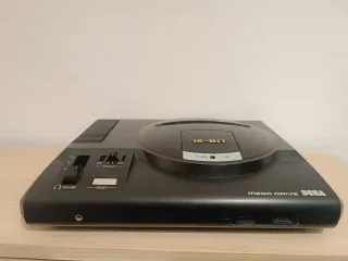 Consola de videojuegos Sega Mega Drive en color negro. En perfecto estado y funciona correctamente. 2 mandos originales y 4 juegos - Diseño clásico. - Botones de encendido y reinicio. - Control de volumen.