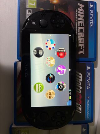 Pack de consola PS Vita con varios accesorios y juegos. - Consola PS Vita negra. - Funda de transporte con diseño de cuadros. - Tarjeta de memoria. - Carcasa protectora roja. - Juego Minecraft: PlayStation Vita Edition. - Juego Tadeo Jones: El Manuscrito Perdido. - Juego FIFA 15 Legacy Edition. - Juego MotoGP 14.