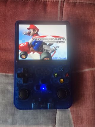 Consola portátil de diseño transparente en color azul. Ideal para disfrutar de juegos clásicos. Modelo R36S. Memoria original de 128GB. Nueva. Solo abierta para hacer las fotos.
