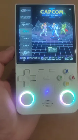 Consola portátil de estilo retro con pantalla. - Diseño en color blanco. - Interfaz de juegos con opciones como MAME, CPS-1, CPS-2 y CPS-3. - Botones de control y joysticks circulares con iluminación LED.