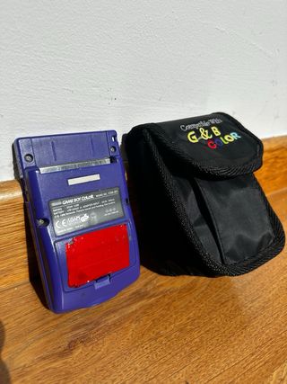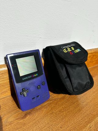 Consola portátil Game Boy Color en color morado. Incluye varios juegos. - Juego: Super Mario Bros. - Juego: Harry Potter. - Juego: Mario & Luigi. - Funda para Game Boy Advance.